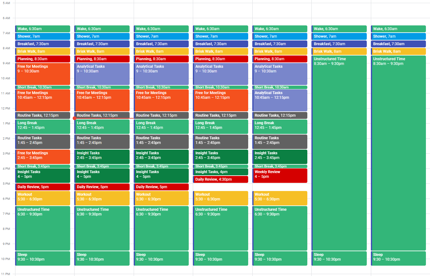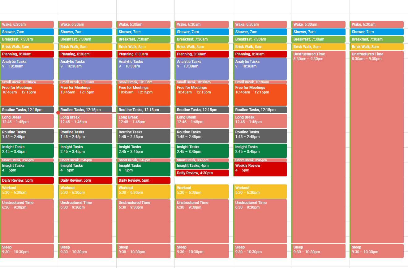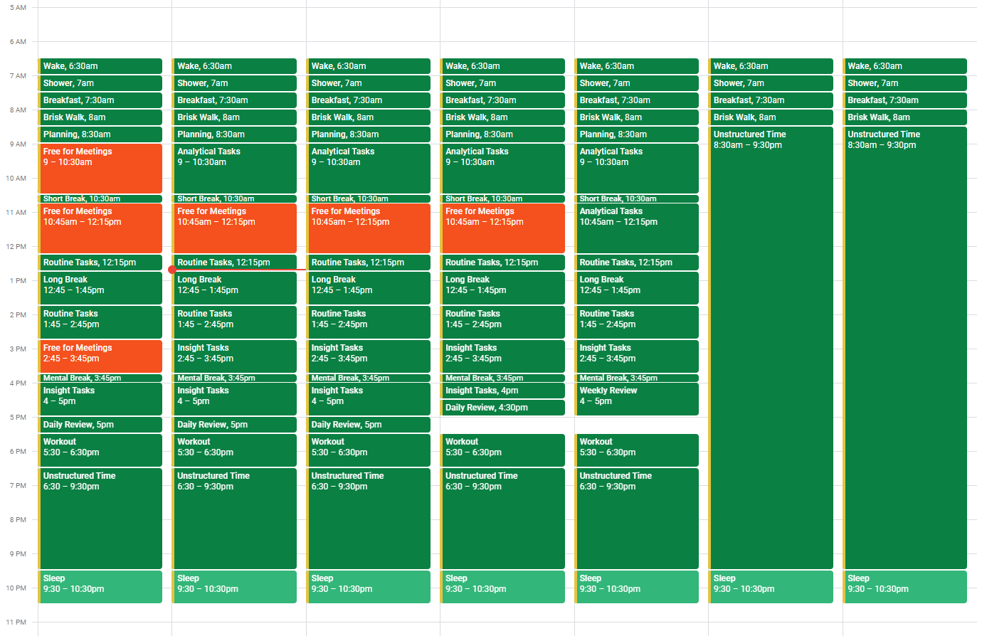 This may be the best approach for an employee that struggles to maintain control over their calendar. By using two colors to establish when the employee lacks control (orange), and when they have control (green), this keeps them accountable to what they can and can’t take on.