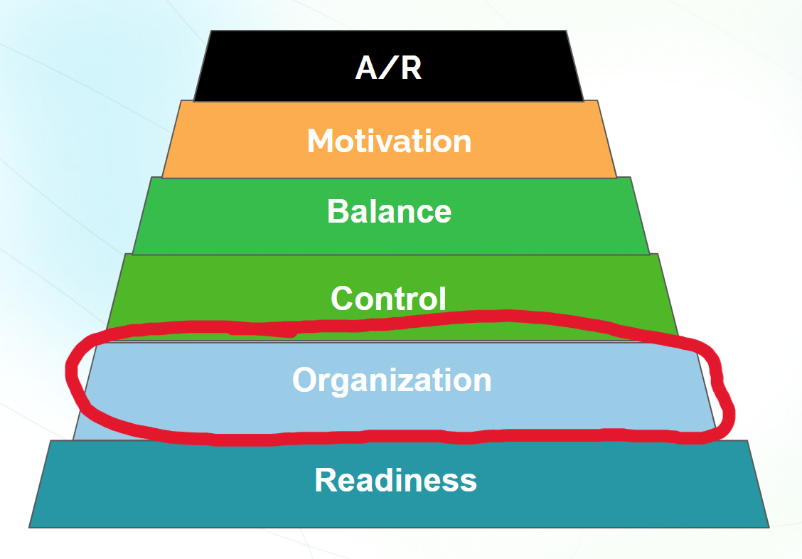 Once we’re feeling “Ready” for work, we can start to move up the pyramid to Organization. To succeed in the modern work environment, being organized is essential—and this is highly personal. It’s not just about how we organize our files; it includes our calendars, our time, our relationships, and our digital resources.
