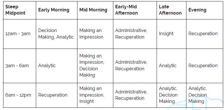 Later in the afternoon, I tend to regain some energy and can return to more analytical work. In the evening, I need time to recuperate as I usually experience brain fog around 5:30 p.m. A side note - it is really interesting to experiment with organizing your day based on this chart, but it is not spot-on for everyone. However, it is a great place to start.